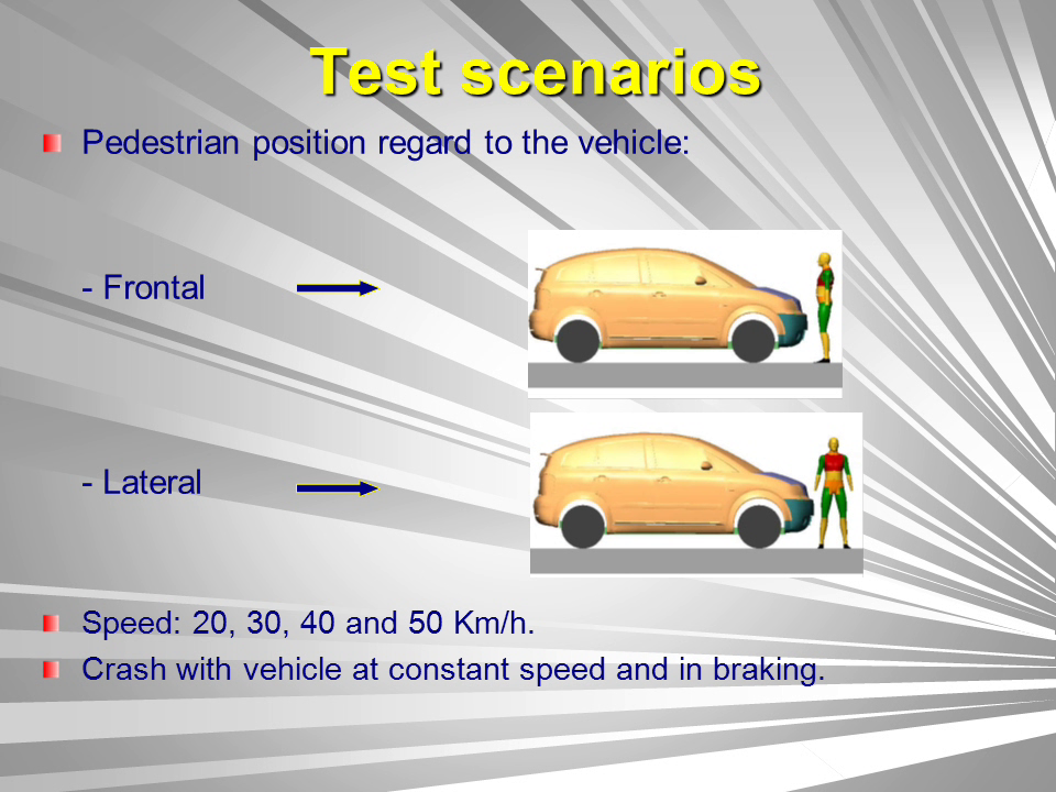 Simulations are performed for both frontal impacts and lateral impacts, when the vehicle is travelling at a constant speed and when the vehicle is braking, following the Euro NCAP rules on the subject.